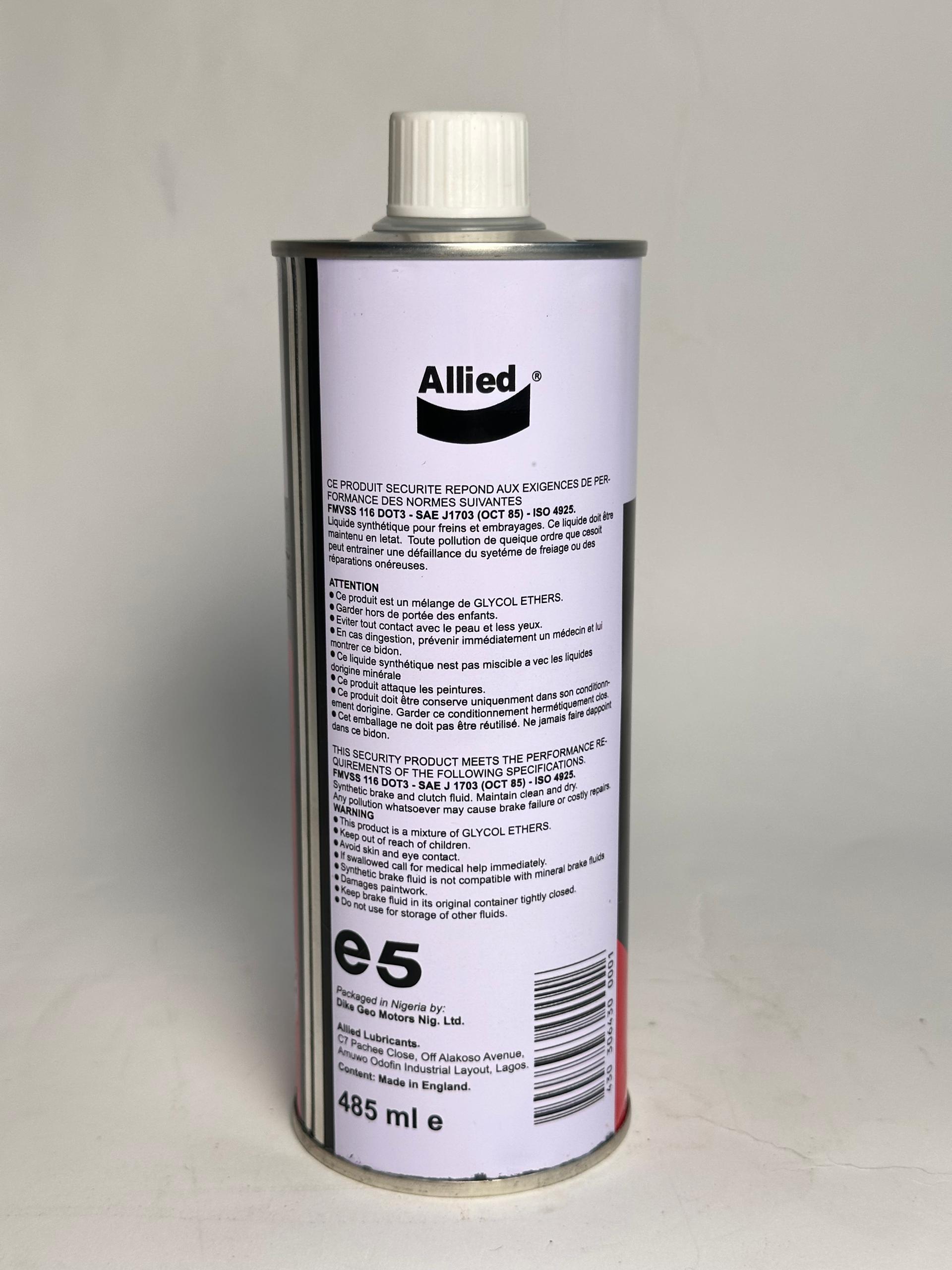 The Allied DOT 3 Brake Fluid (1 Liter) is a reliable and high-performing brake fluid designed to deliver consistent braking power under various driving conditions. Formulated to meet international standards, it ensures smooth hydraulic brake operation, prevents vapor lock, and provides excellent protection against rust and corrosion in the braking system.